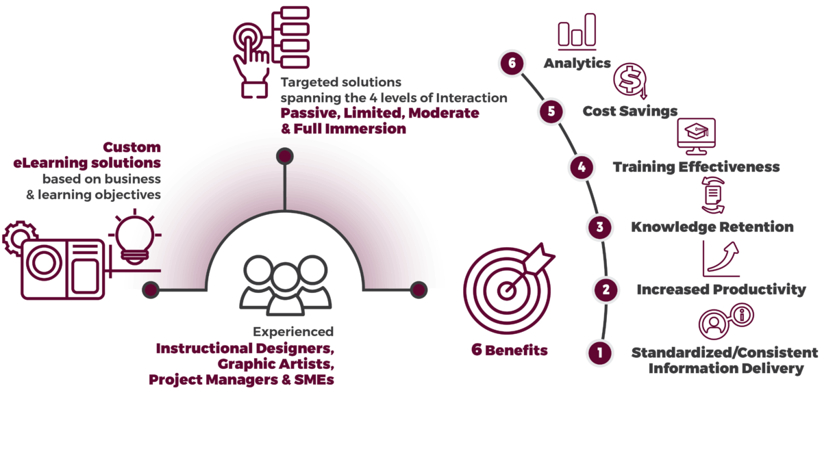 eLearning solutions are accomplished with experienced Instructional Designers, Graphics Artists, Project Managers and Subject Matter Experts (SMEs), developing custom and targeted solutions based on your business and learning objectives.
