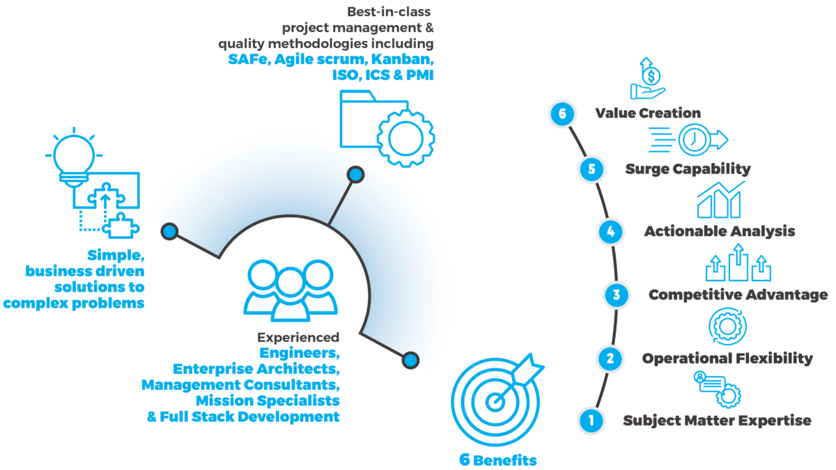 With a team consisting of experienced Engineers, Enterprise Architects, Management Consultants and Mission Specialists, we are a leading provider of program and project management consulting and engineering support services using well known tools such as SAFe, Agile Scrum, Kanban, ISO, ICS & PMI.